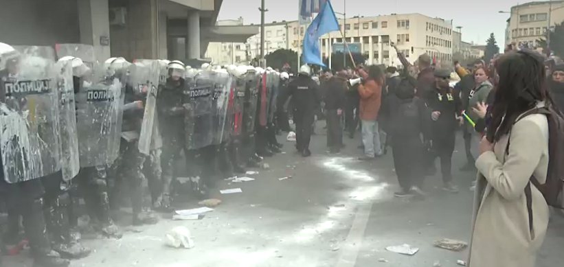 Додаваат дека за време на сузбивањето и растерувањето на толпата, неколку лица фрлиле пиротехнички средства кон полицајците – топовски истрели и димни бомби, а фрлале и разни предмети, камења и тули кон полицајците.