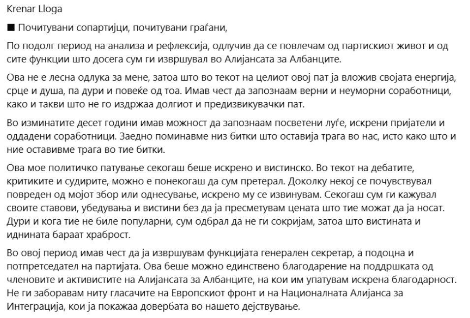 „Ова не е лесна одлука за мене, затоа што во текот на целиот овој пат ја вложив својата енергија, срце и душа, па дури и повеќе од тоа. Имав чест да запознаам верни и неуморни соработници, како и такви што не го издржаа долгиот и предизвикувачки пат. Во изминатите десет години имав можност да запознаам посветени луѓе, искрени пријатели и оддадени соработници. Заедно поминавме низ битки што оставија трага во нас, исто како што и ние оставивме трага во тие битки. Ова мое политичко патување секогаш беше искрено и вистинско. Во текот на дебатите, критиките и судирите, можно е понекогаш да сум претерал. Доколку некој се почувствувал повреден од мојот збор или однесување, искрено му се извинувам. Секогаш сум ги кажувал своите ставови, убедувања и вистини без да ја пресметувам цената што тие можат да ја носат. Дури и кога тие не биле популарни, сум одбрал да не ги сокријам, затоа што вистината и иднината бараат храброст. Во овој период имав чест да ја извршувам функцијата генерален секретар, а подоцна и потпретседател на партијата. Ова беше можно единствено благодарение на поддршката од членовите и активистите на Алијансата за Албанците, на кои им упатувам искрена благодарност. Не ги заборавам ниту гласачите на Европскиот фронт и на Националната Алијанса за Интеграција, кои ја покажаа довербата во нашето дејствување. Јас сум израснат во семејна, политичка и патриотска средина, роден во семејство кое избрало опстанок понекогаш преку земјоделство, а понекогаш преку печалба, единствено за да може полесно да се спротивстави и да се соочи со југословенскиот режим. Израснав меѓу двајца браќа кои останале без имиња до прво одделение, бидејќи режимот не дозволувал ‘иредентистички’ албански имиња, израснав опкружен со фамилијарни политички затвореници, диференцирани и прогонувани, воспитан со духот на националната преродба и патриотизмот – дух кој секогаш ќе ме поддржува, без оглед на улогата што животот ќе ми ја понуди. Имам многу што да раскажам… Се надевам дека еден ден ќе најдам храброст сето тоа да го ставам на хартија“, пишува Лога.