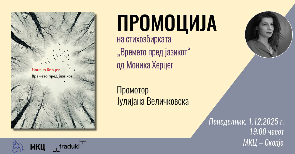 В понеделник, 1 декември, од 19:00 часот во киното „Фросина“ во Младинскиот културен центар ‒ Скопје, ќе се одржи промоција на стихозбирката „Времето пред јазикот“ од хрватската поетеса, драмска авторка, есеистка, активистка и уредничка Моника Херцег.