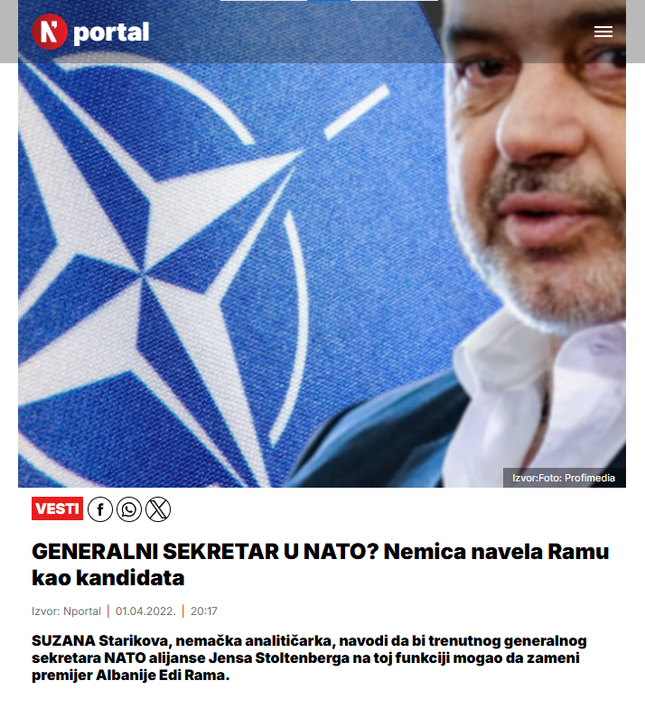 „Германската аналитичарка, академик и истражувач Сузана Стариков тврди дека Еди Рама е следниот генерален секретар на НАТО по Јенс Столтенберг“, веќе утрото осамна насловот во неколку тирански медиуми.