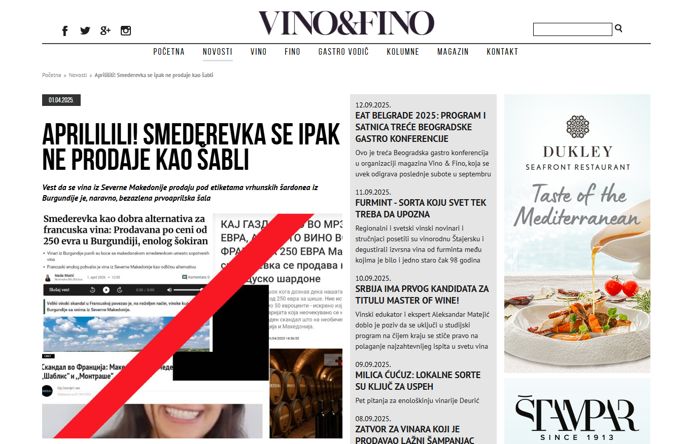 Додека „Вино и фино“ попладнето културно објави дека текстот е првоаприлска шега, „скандалот“ веќе го пренесоа безмалку сите македонски – пред сè онлајн – медиуми. Најголем дел со сосема идентичен наслов, добар дел со идентичен текст, но ниеден со проверка на наводите на српскиот медиум.