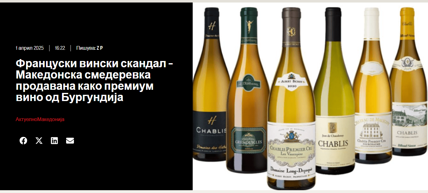 „Скандал во Франција: македонска смедеревка продавана како бургундско вино за 250 евра по литар!“, „Француски вински скандал – македонска смедеревка продавана како премиум вино од Бургундија“, „Французите продавале македонско вино како свое“, „Француски вина се полнеле со македонска смедеревка од Мрзенци“, „Европол: македонска смедеревка се продавала како француско вино“, „Кај газда Ѓоко во Мрзенци е 0,5 евра, а истото вино во Франција 250 евра“… Но и поумерени, како „Смедеревка како добра алтернатива за француски вина продавана за 250 евра.