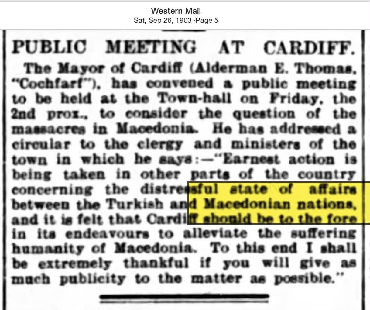 Градоначалникот на Кардиф (Алдерман Е. Томас, „Кохфарт“) договори јавна средба што ќе се одржи во Градското собрание во петок, за да се разгледа прашањето за масакрите во Македонија. Тој упати циркуларно писмо до свештенството во градот, во кое се вели: ‘Во други делови од земјата се преземаат сериозни мерки во врска со тешката состојба меѓу турската и македонската нација и смета дека Кардиф треба да биде прв во своите напори за ублажување на страдалното човештво во Македонија. За таа цел, ќе бидам исклучително благодарен ако дадете што е можно поголем публицитет на ова прашање’ “, е наведено во објавата на Вестен меил од Кардиф, на 26 септември 1903 година.