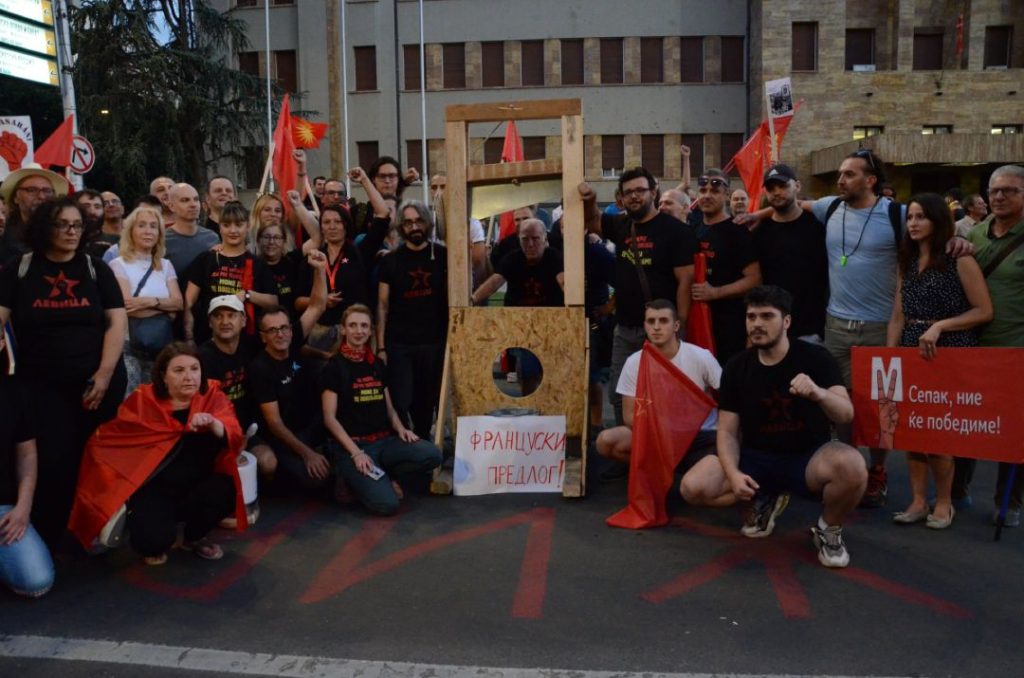 На протестите пред Собранието во Скопје беше донесена и импровизирана гилотина | Фото: ФБ страна на политичка партија Левица
