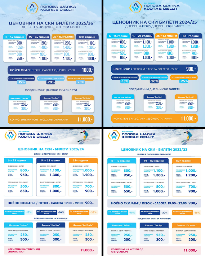 Скијачката сезона 2025/26 на Попова Шапка започна со зголемување на цените на дневните и сезонските билети. Во меѓувреме, сезонскиот билет не покрива и ноќно скијање, за што се жалат скијачите, а според раководството на ски центарот, за ноќно скијање потребни се дополнителни ангажмани и трошоци, пишува Порталб.мк.