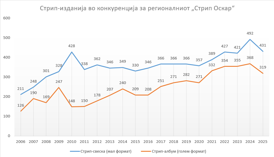 Според податоците за бројот на изданија пријавени во овој избор, може да се заклучи дека пазарот на стрипови во регионот e релативно стабилен, со благ пад на продукцијата во 2025 година. Од оваа евиденција се генерално самоисклучени македонското, црногорското и косовското издаваштво, кои имаат по неколку изданија годишно, кои тамошните издавачи и не се трудат да ги пријават во базата на stripovi.com.