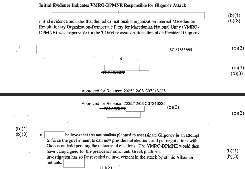 „Првичните докази укажуваат дека радикалната националистичка организација Внатрешна македонска револуционерна организација-Демократска партија за македонско национално единство (ВМРО-ДПМНЕ) била одговорна за атентатот врз претседателот Киро Глигоров на 3 октомври. (Редактирано) смета дека националистите планирале да го убијат Глигоров со цел да ја принудат владата да распише нови претседателски избори и да ги стави во мирување преговорите со Грција до завршување на изборите. Потоа ВМРО-ДПМНЕ би водела претседателска кампања на антигрчка платформа. Истрагата досега не открила никаква вмешаност на радикални етнички албански групи во нападот“, пишува во декласифицираните документи.