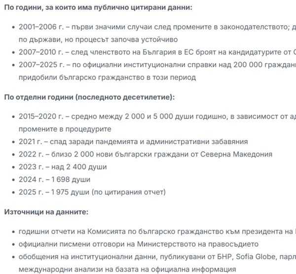 Но бројките се во најмала рака сомнителни, зашто исто така според официјални податоци, во последната деценија (2015-2025) просечно меѓу 2 и 5 илјади македонски граѓани годишно се стекнувале со бугарски пасош. Ако се земе просекот од еве нека се и 5 илјади граѓани годишно, произлегува дека околу 50 илјади Македонци стекнале и бугарско државјанство од 2015 до 2025 г. На пример во 2025 година нешто под 2.000 изнесувал тој број, тврди истиот извор што се повикува на официјални податоци.