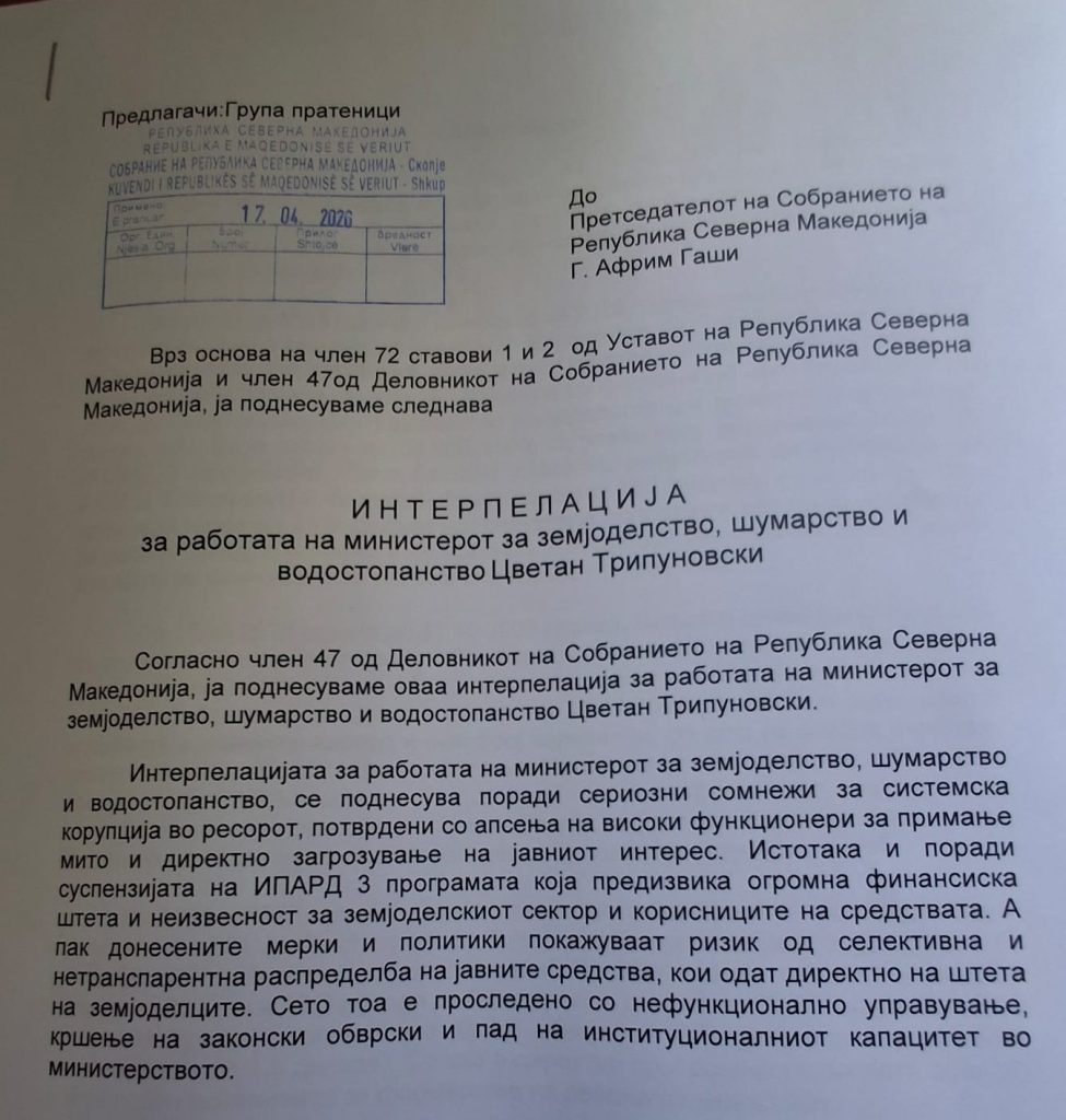 Денес на прес-конференција, Социјалдемократскиот сојуз на Македонија поднесе интерпелација кон министерот за земјоделство, Цветан Трифуновски, обвинувајќи го за корупција, скандали и штетни политики во ресорот.